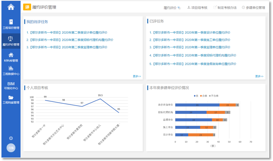 系統(tǒng)支持制定評價辦法,發(fā)起評價任務(wù),對參建單位進行履約評價。通過評價結(jié)果,對參建單位進行管理并設(shè)置參建單位黑名單,并根據(jù)履約評價結(jié)果進行綜合排名。