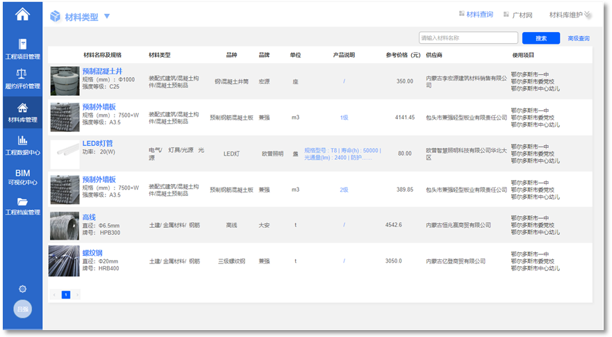 材料庫主要對項目過程中已使用材料的類型、名稱、參數(shù)、價格、型號以及所用項目進行管理,方便在新建項目時快速定位同類型、高品質(zhì)、價格合理的材料。