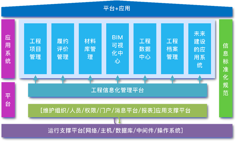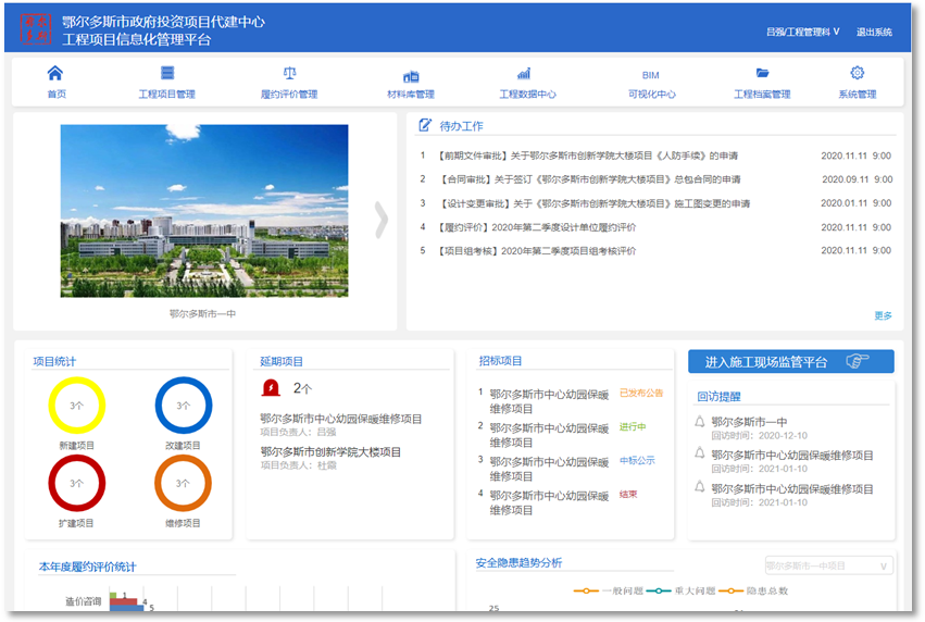 該平臺由工程項目管理、履約評價管理、材料庫管理、工程數(shù)據(jù)中心、BIM可視化中心、工程檔案管理六個子系統(tǒng)組成。主要包含了立項管理、前期手續(xù)管理、招投標管理、合同管理、設(shè)計管理、施工現(xiàn)場管理、投資控制、工程驗收、質(zhì)保期管理、項目后評價、參建單位履約評價、工程檔案管理、工程數(shù)據(jù)中心、BIM可視化中心、等功能,對近40個業(yè)務(wù)單位進行精細化管理。