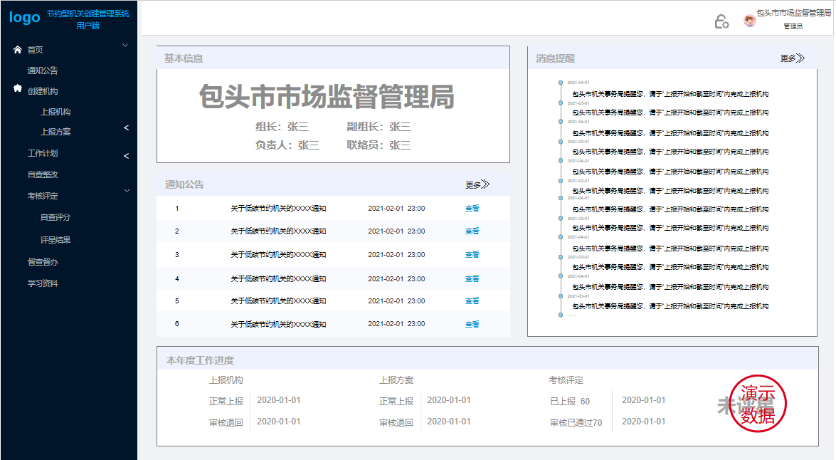 主要實(shí)現(xiàn):上報(bào)創(chuàng)建機(jī)構(gòu)、上報(bào)方案,制定工作計(jì)劃并記錄完成情況,對(duì)本單位進(jìn)行自查并記錄自查整改記錄,根據(jù)下發(fā)考核任務(wù)對(duì)本單位進(jìn)行評(píng)分并上傳自評(píng)報(bào)告。以及低碳節(jié)約相關(guān)學(xué)習(xí)學(xué)習(xí)資料的查閱。